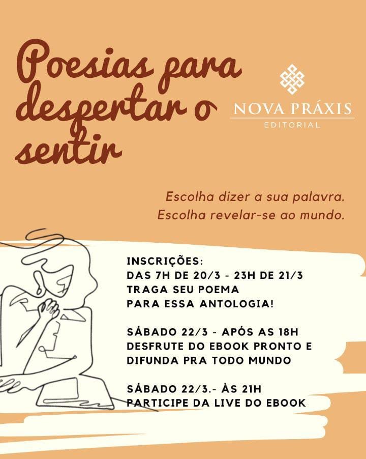 Ebook (antologia) de poesia produzido em 24h com tudo: capa e diagramação exclusivas, ISBN, ficha feita por bibliotecária! A emoção da parte do pacote! Inscrições dias 20 e 21/3. Entrega do ebook e Live de lançamento: SÁBADO dia 22/3 – às 21h