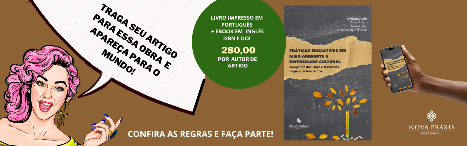 Declaro que o(s) artigo(s) encaminhado(s) são de minha autoria, bem como que estou ciente e aceito inconteste as regras éticas, as condições e os prazos apresentados no edital da obra PRÁTICAS EDUCATIVAS EM MEIO AMBIENTE E DIVERSIDADE CULTURAL Autorizo a publicação de meu(s) artigo(s), ora inscritos, caso sejam aprovados, por meio físico ou digital pela Nova Práxis Editorial, bem como sua comercialização pela mesma e seus marketplaces parceiros – ciente de que nada será devido a mim, a título de participação em vendas ou lucros, em quaisquer formatos ou idiomas a que venha ser apresentada. Agradeço, também, o desconto cortesia de 35% sobre o valor da obra no site da editora – mediante cupom específico a ser informado – o qual poderei socializar com meus amigos e minha rede de contato.